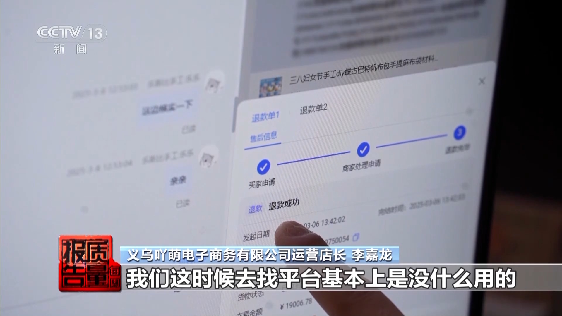 义乌吖萌电子商务有限公司运营店长 李嘉龙:客户在收到货两天之后发起了一个仅退款,我们发现之后去联系客户,让客户申请换货去帮他处理,但是客户没有同意。平台收到这个仅退款之后,相当于整个订单金额19000元直接退给客户了,我们这时去找平台基本上是没什么用,这么大的订单如果线上追不回来,一般我们会去线下找客户追这个款。