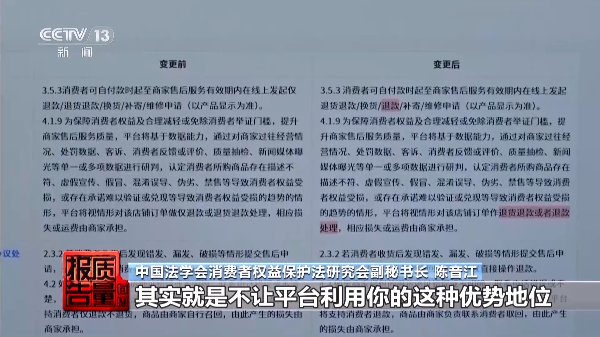 中国法学会消费者权益保护法研究会副秘书长 陈音江:从我们了解的情况来看,其实平台上基本上取消了这种强制平台内的商家执行仅退款规定的做法,所以也基本上达到了规范和治理的目的,因为规范治理的目的其实就是不让平台利用优势地位去强迫平台内的商家,执行高于法律规定的标准或者规则。要把自主经营的权利交给平台内的商家。